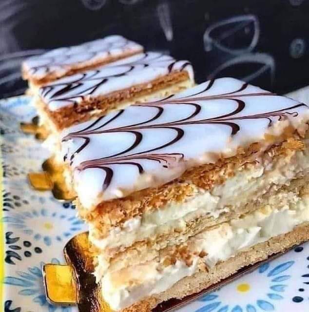 Powtórz z kolejną warstwą ciasta francuskiego i kremu do ciasta, kończąc warstwą ciasta francuskiego na wierzchu.