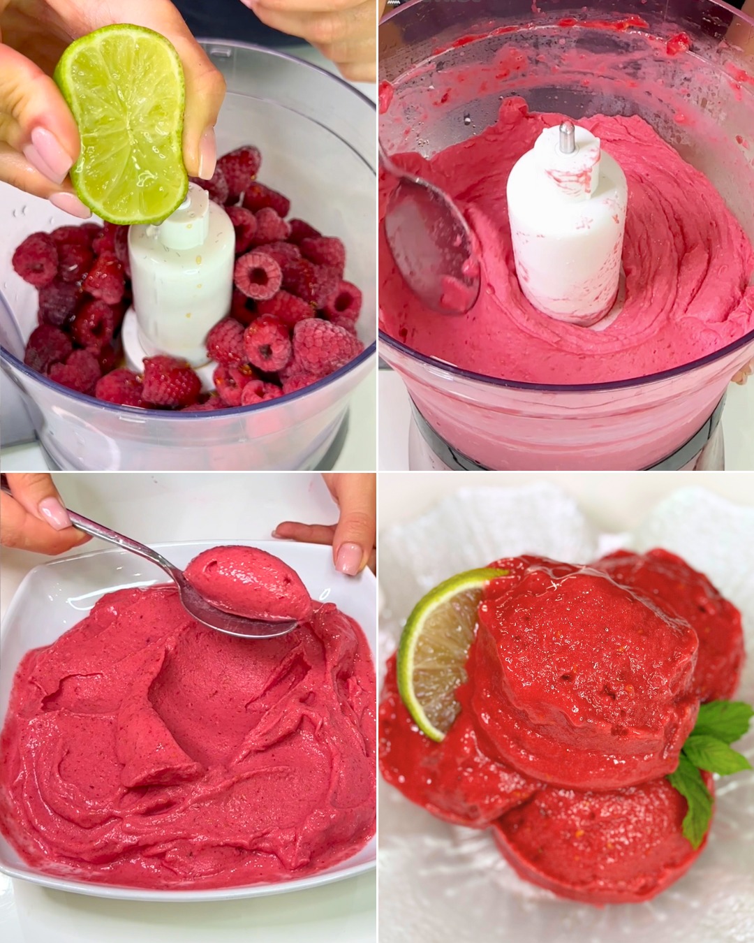Aby go przygotować, wystarczy zmiksować wszystkie składniki w blenderze, a sorbet malinowy będzie gotowy: nasza Melissa podała go po prostu z plasterkiem limonki i kilkoma listkami mięty, ale Ty możesz podać go tak, jak lubisz.